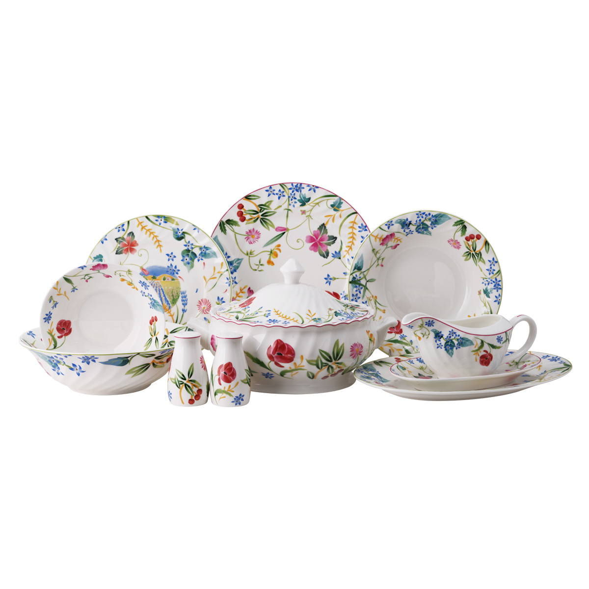 Подстановочная тарелка 27 см – 6 шт, суповая тарелка 23 см – 6 шт, десертная тарелка 21 см – 6 шт, салатник 15 см – 6 шт, салатник 23 см, блюдо овальное 30 см, супница с крышкой, соусник, подставка под соусник, солонка, перечница |